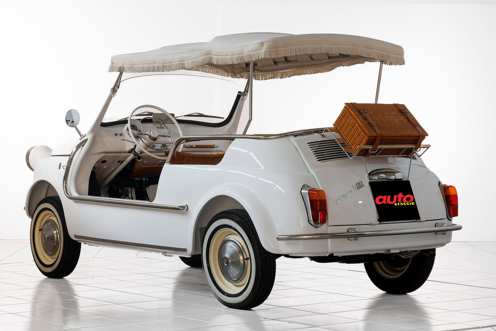 Fedele ricostruzione della mitica Fiat 500 Spiaggina realizzata su base Fiat 500 F e modello originale Jolly Ghia - Restauro totale documentato di Meccanica, interni e carrozzeria. Condizioni pari al nuovo. Targhe originali. | Faithful reconstruction of the legendary Fiat 500 Spiaggina, built on a Fiat 500 F base and original Jolly Ghia model - Complete documented restoration of mechanics, interior, and bodywork. Brand new condition. Original Italian plates. |